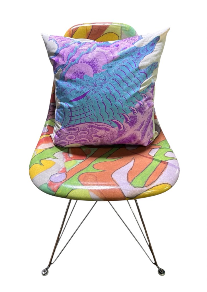 Antler screenprinted cushion dropđđ˝ sitting on Leomiâs rad chair