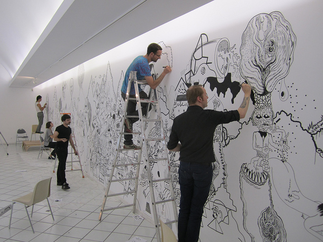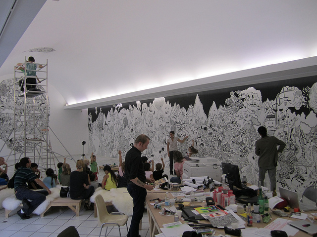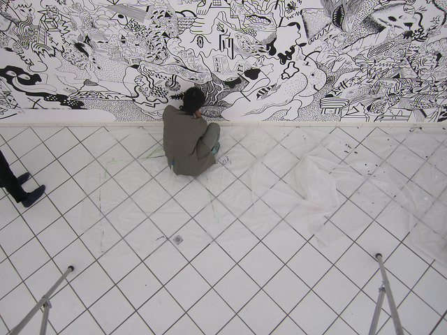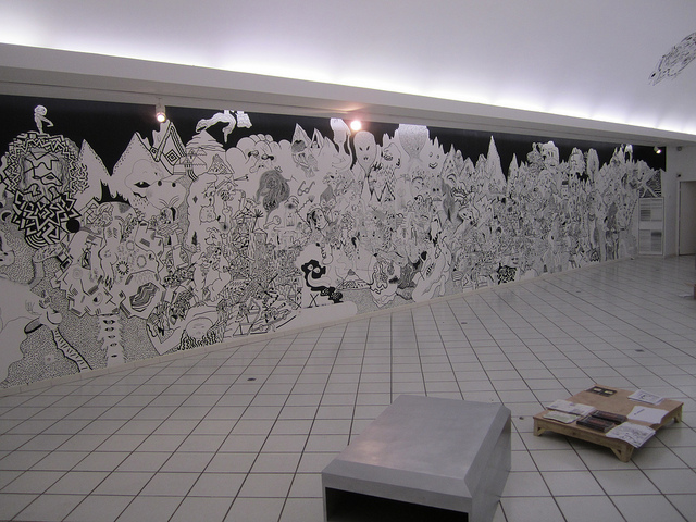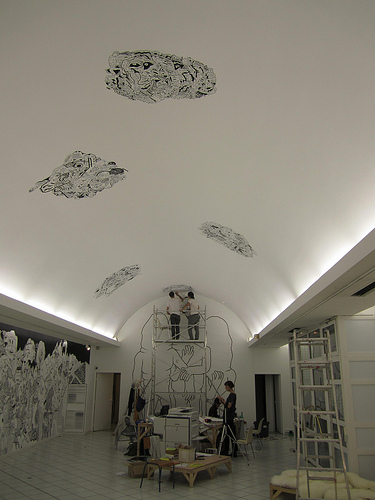 i was invited for doing a workshop in Colomiers, France in 2010. and spent solid one week to draw multiple murals, even on the ceiling too. it was a collaboration with shobo shobo, dennis tyfus, sumi ink club, and hendrik hegray. it was great time to share some spirits with these artists.